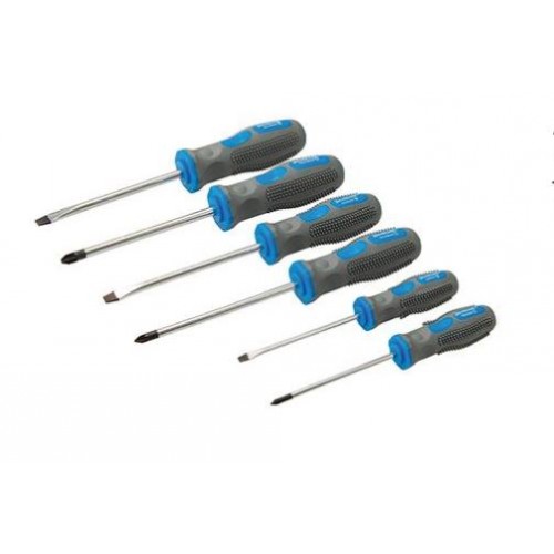 6 piece chrome vanadium screwdriver set with hardened, blackened tips and soft-grip handles. Includes: slotted flared 3 x 75mm, 5 x 100mm, 6 x 100mm; Pozidriv PZ0 x 75mm, PZ1 x 100mm, and PZ2 x 100mm.