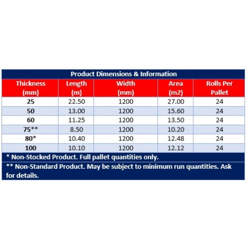 Thicknesses: 25, 50, 60, 75, 80 or 100mm (Please see table in images for further information)