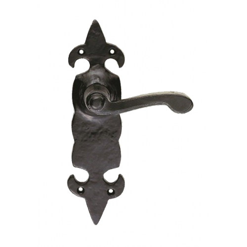 A sturdy classical scroll lever on an undulating edged backplate with fleur-de-lys pattern top and bottom.